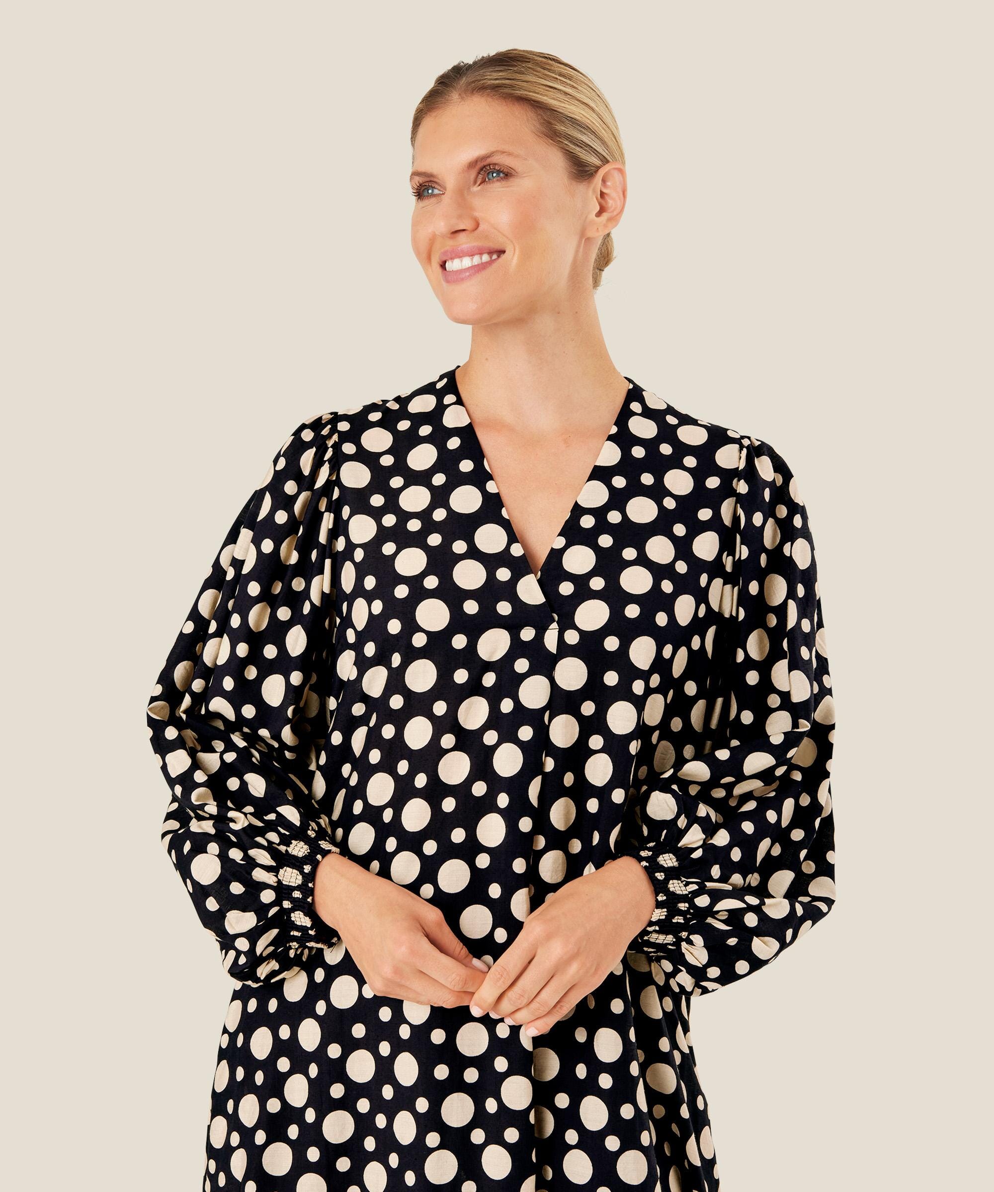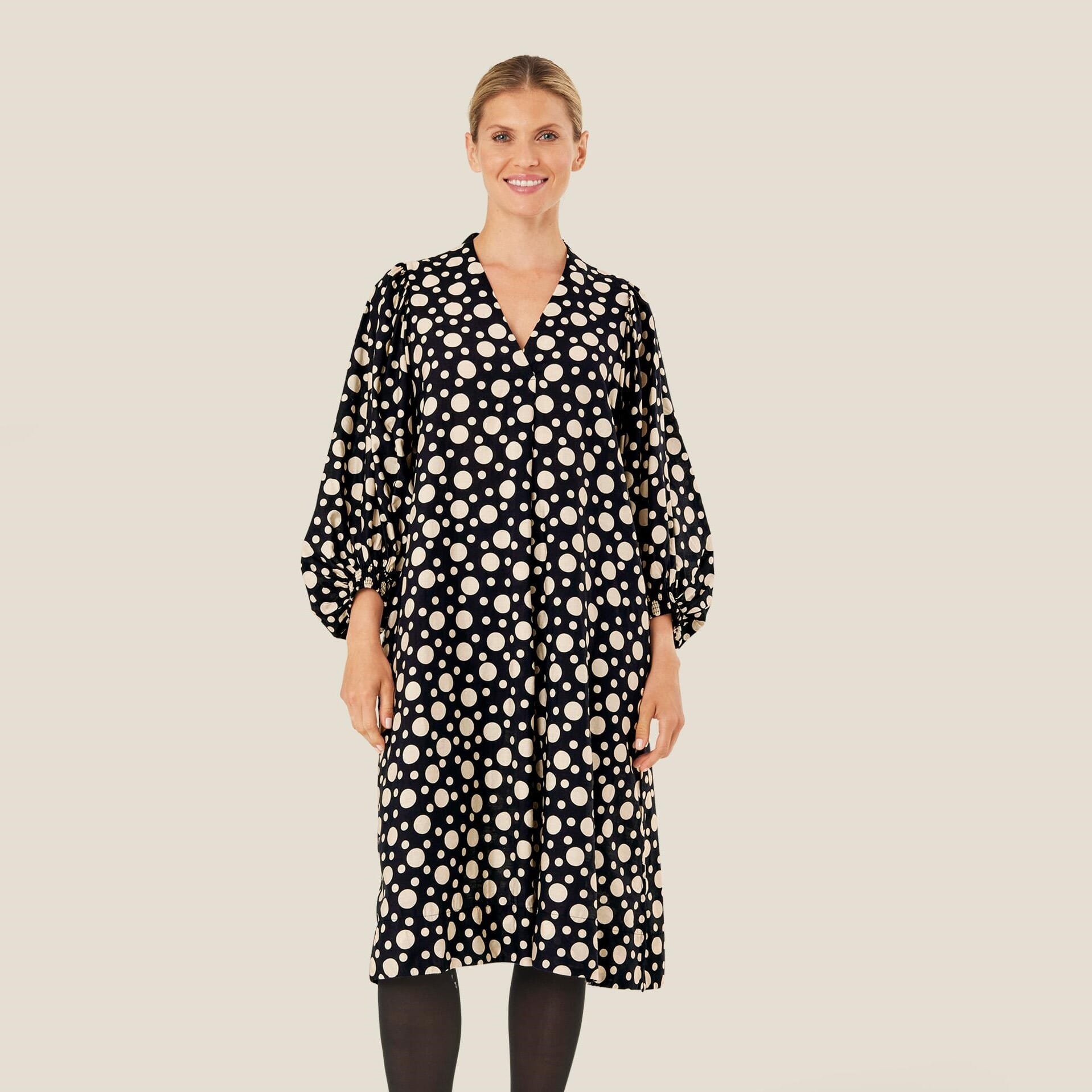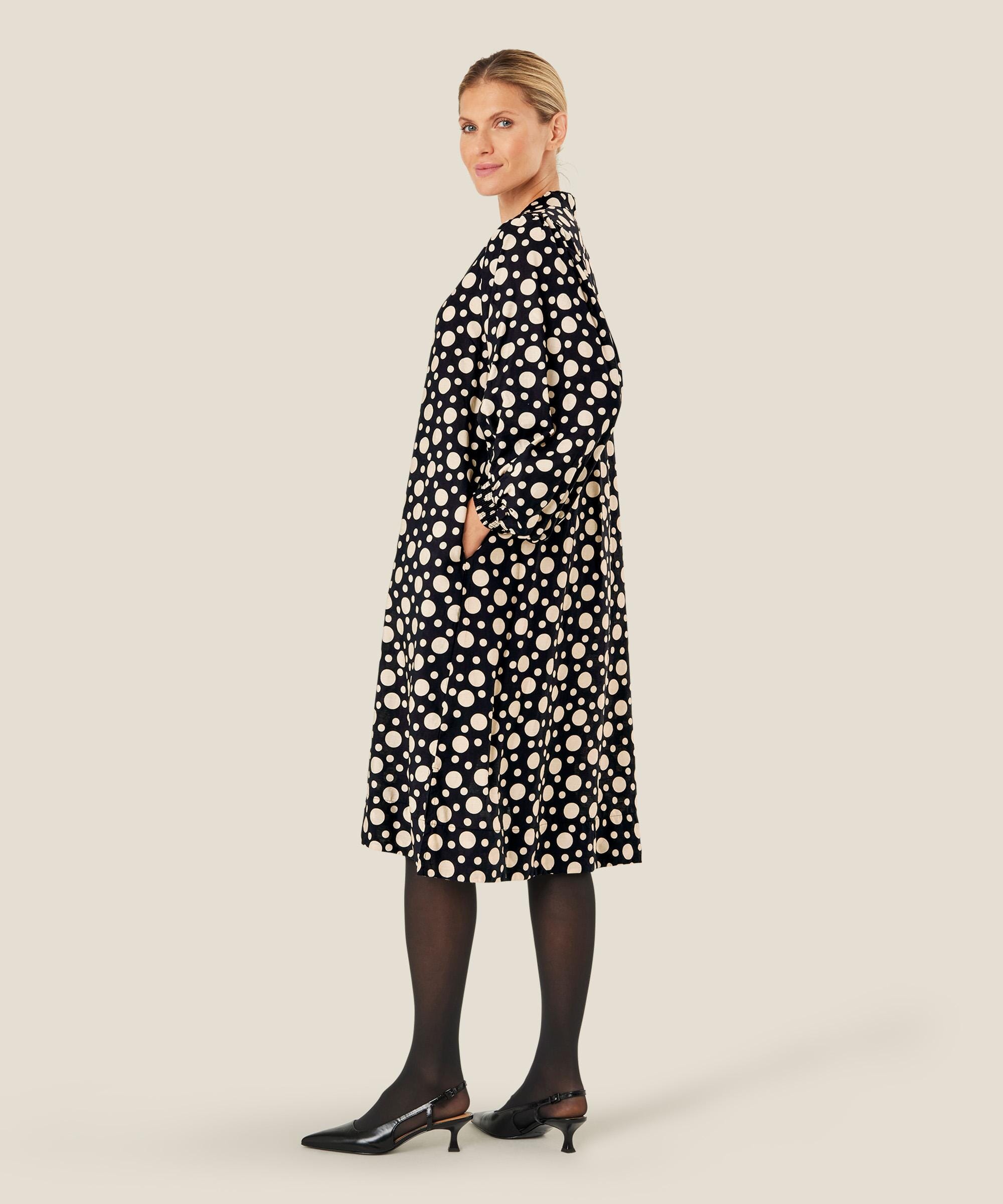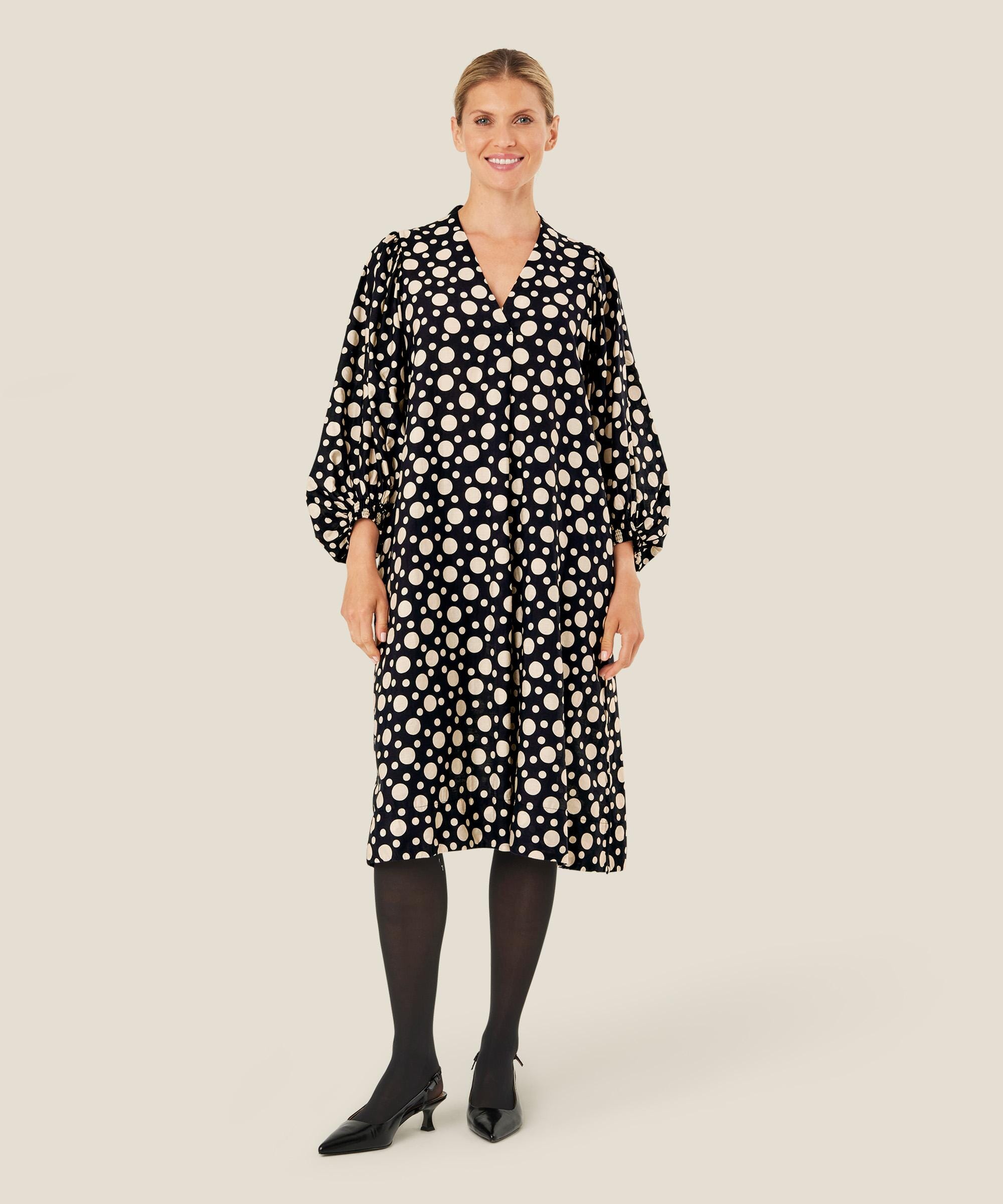 Slipp prikkene løs i garderoben din med denne sprudlende, elegante kjolen. Kjolen er skåret i et vakkert A-formet snitt med dyp V-hals. Det myke og lett transparente viskosematerialet faller mykt og behagelig over kroppen og gjør kjolen behagelig å ha på. Den er også designet med diskrete splittlommer på sidene og voluminøse ermer med elastiske kanter. Style kjolen med et par høye støvletter for en uanstrengt og stilig look.