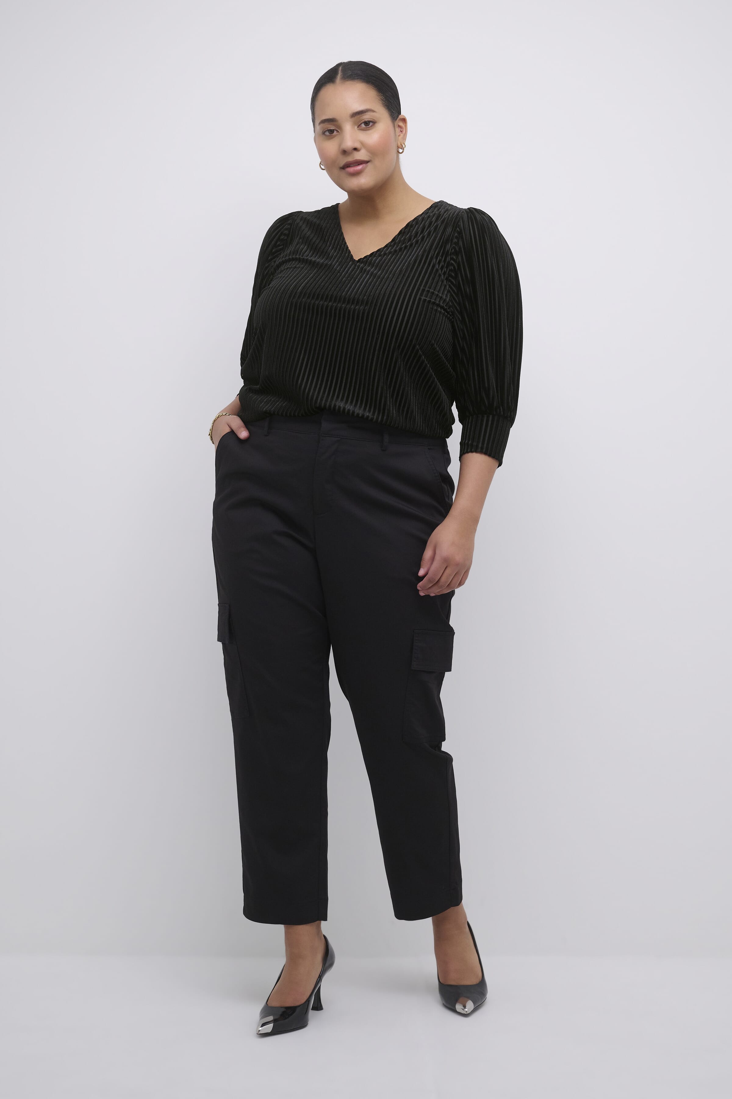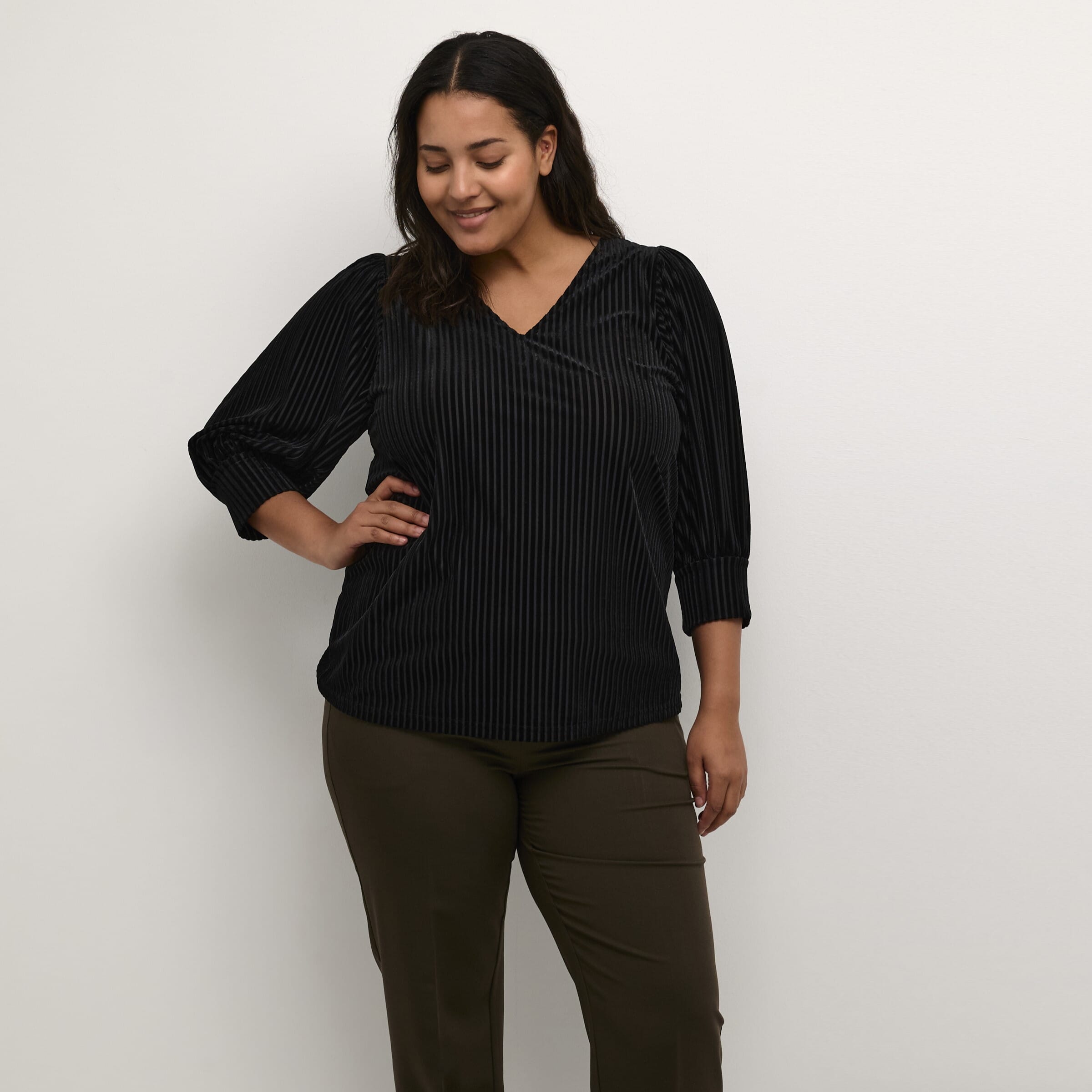 Kjempefin bluse fa Kaffe Curve. V-hals og lett glimmer i stoffet. Kan brukes til både hverdags og fest!