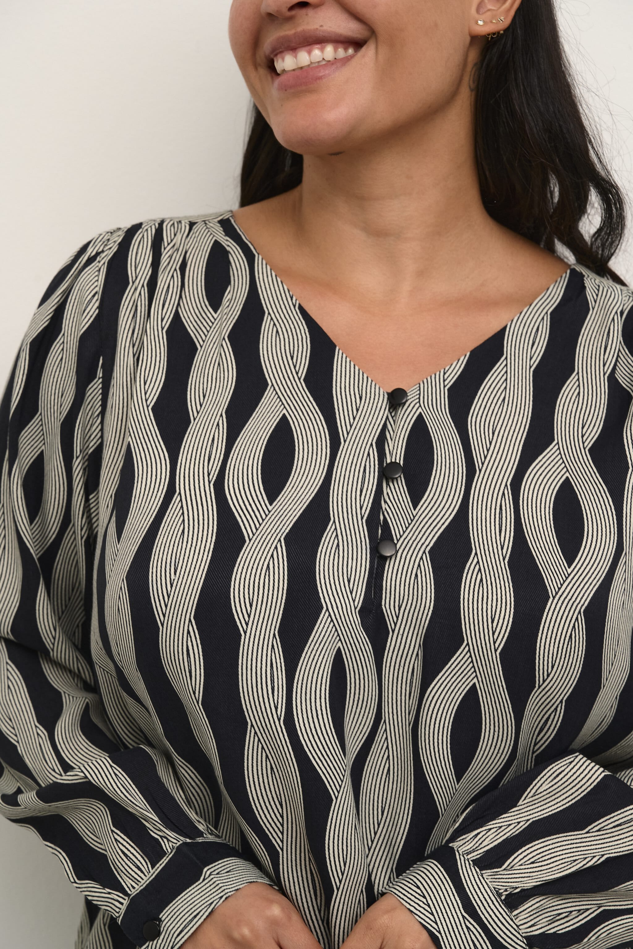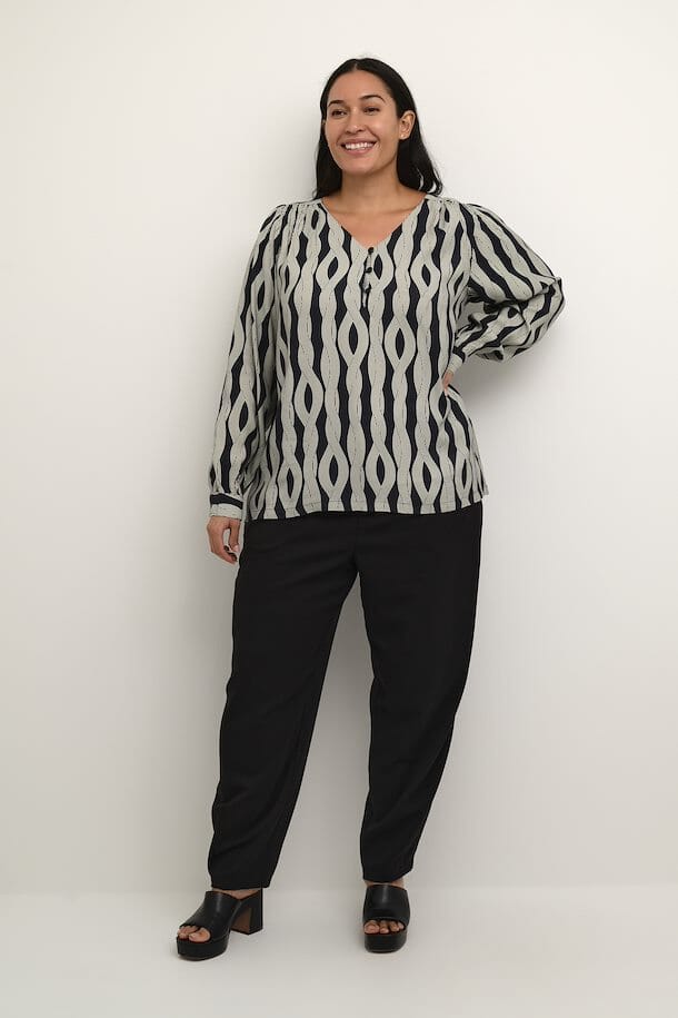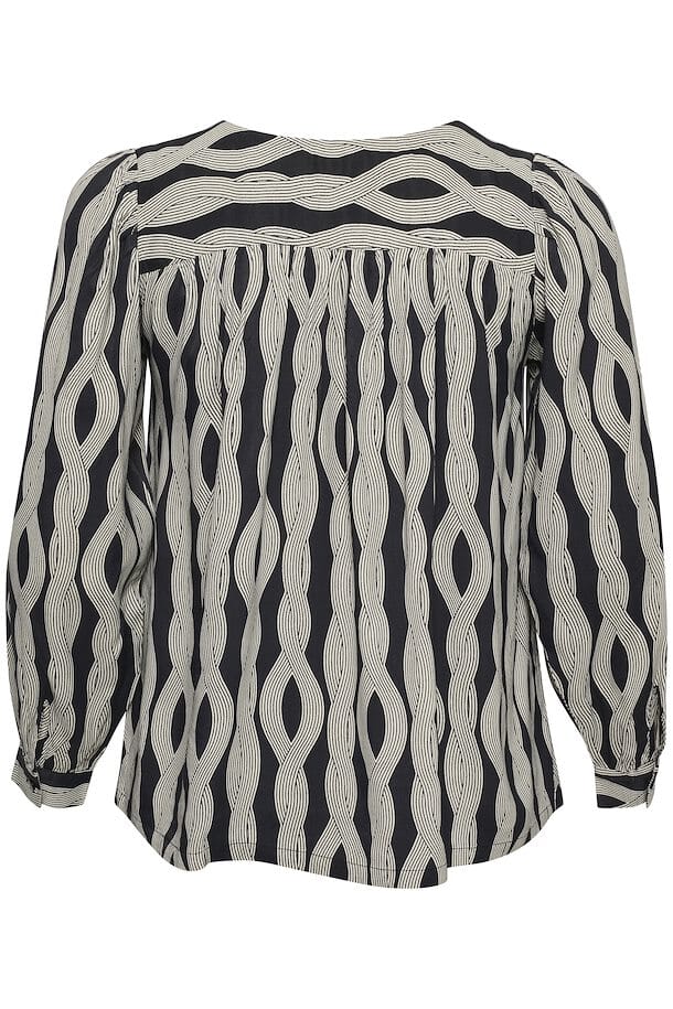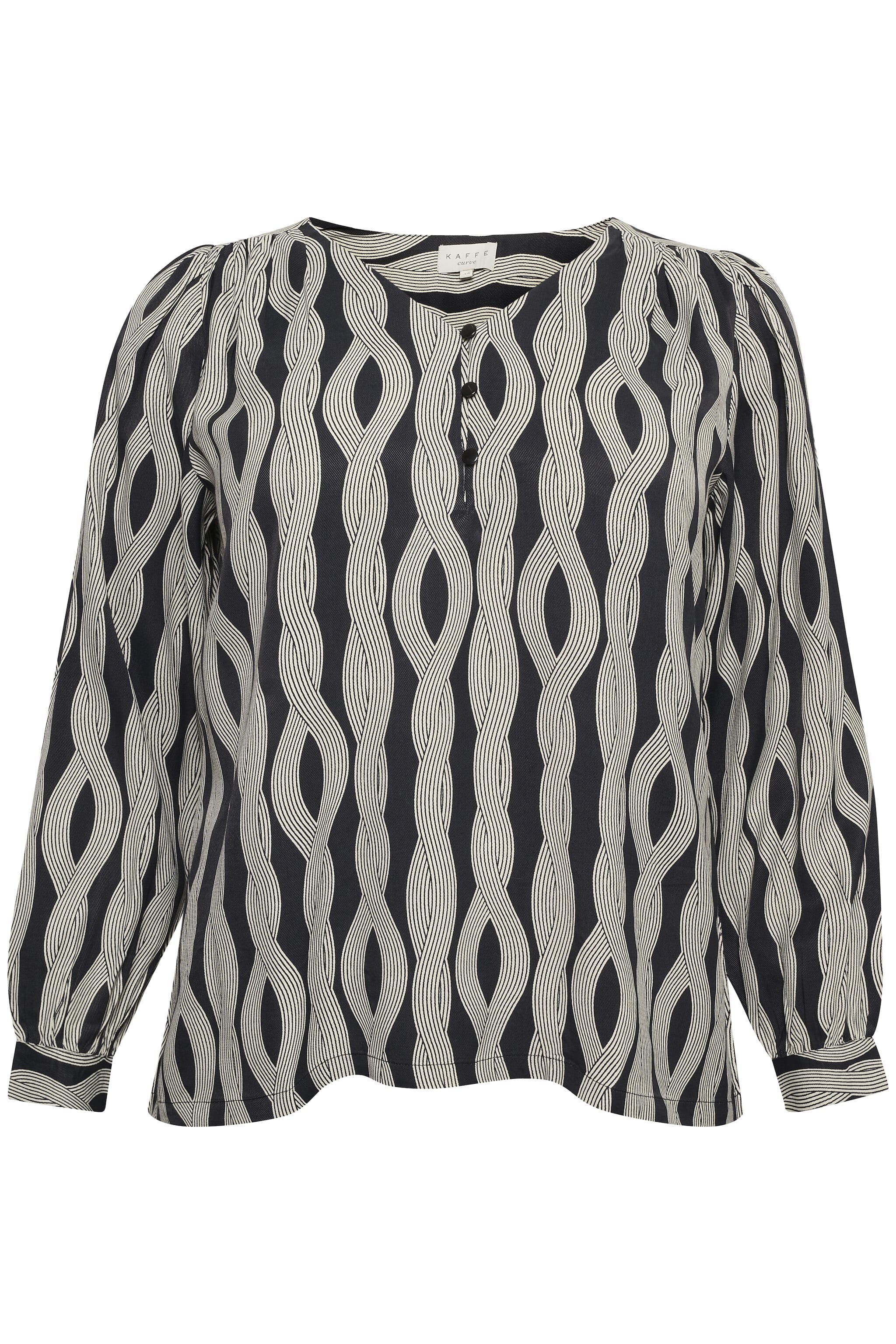 Pen bluse fra Kaffe Curve i et flott print. Knappedetaljer i front på brystet og lange ermer. Passer fint med jenas og skjørt. Veldig sprekt med dette skjørtet, slik at du fåt et sett; https://www.gerdholms.no/klaer/skjort/kaffe-curve-carly-skirt-black-rope-print