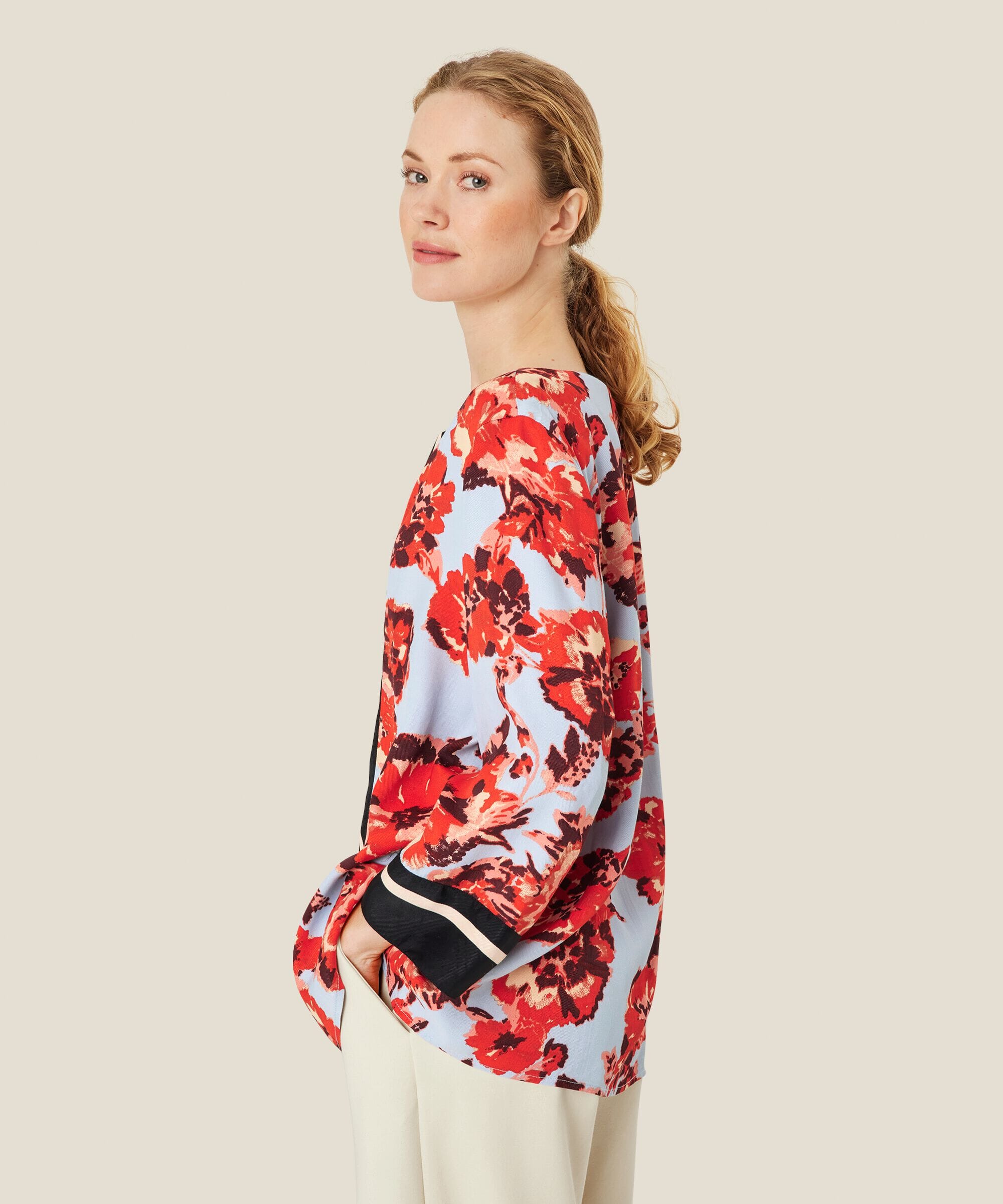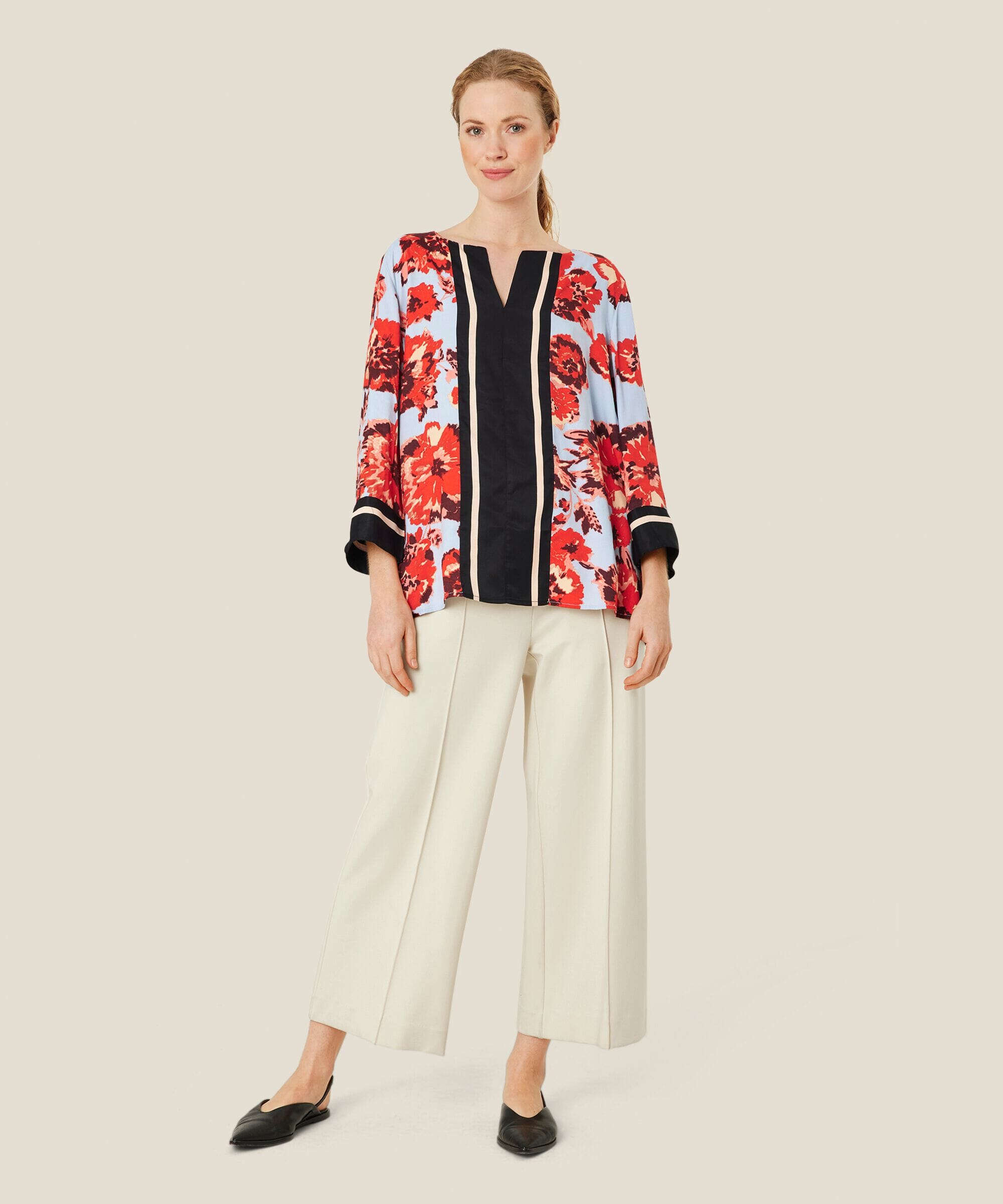 Elegant og lekker topp fra Masai i deilig viskose. Feminin slipp i halsen, lange ermer og et flatterende a-formet snitt. Kan fint styles med både lyse og sorte bukser.