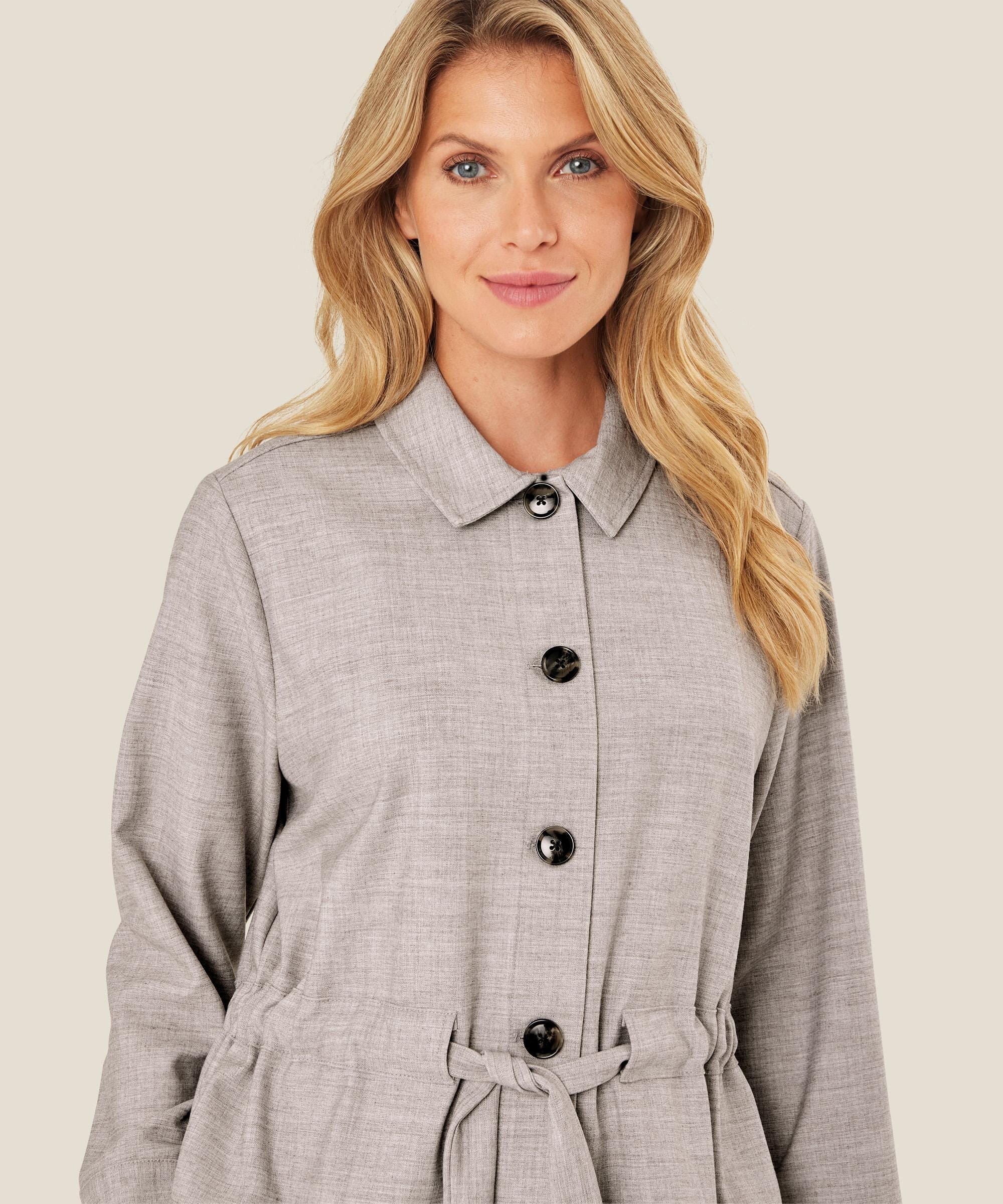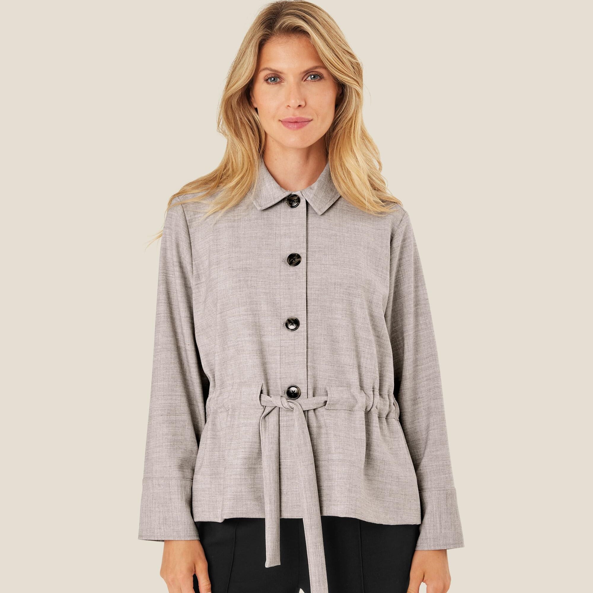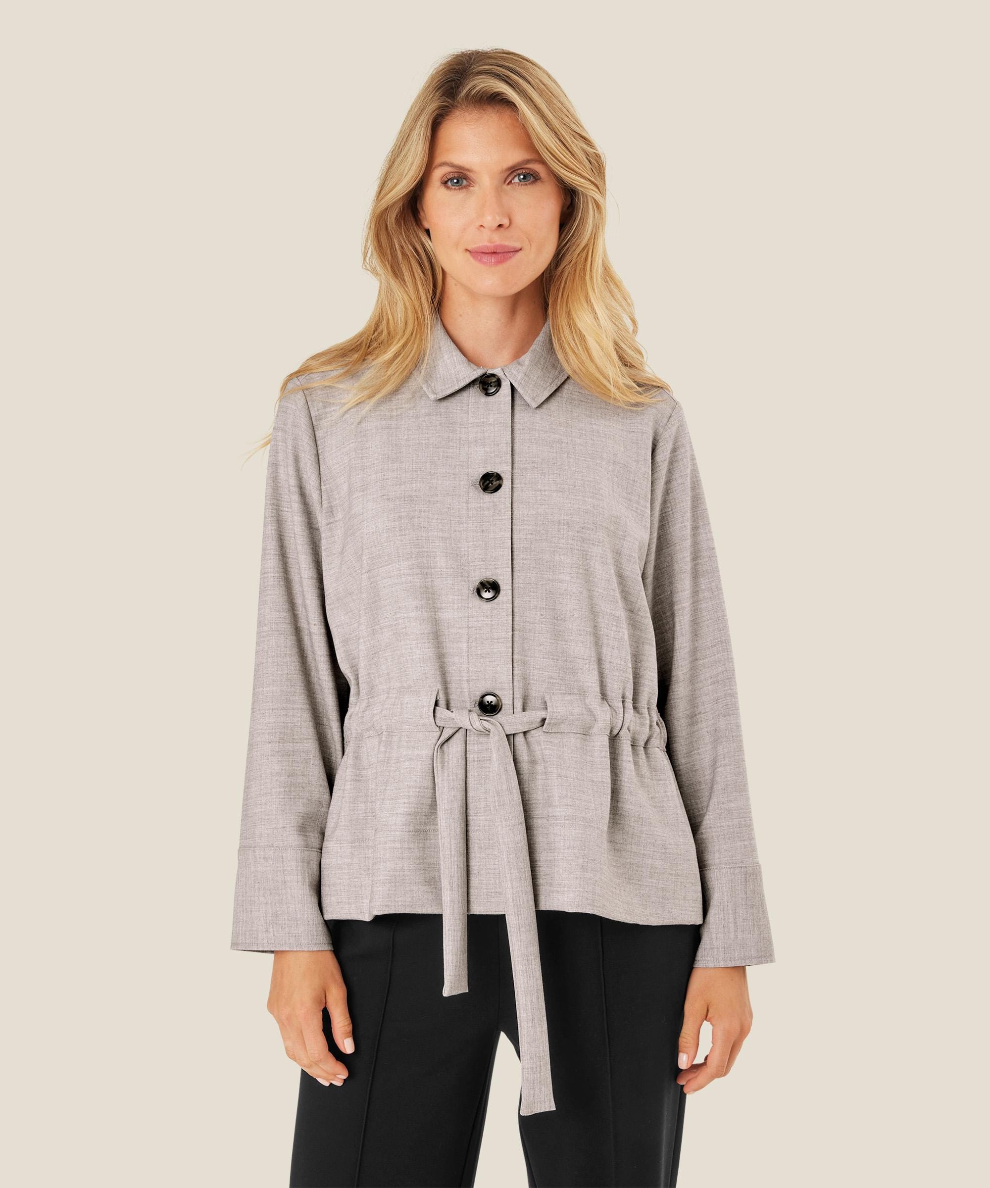 La denne jakken gi avslappet eleganse til looken din. Den er designet i et mykt materiale av lyocell, som gjør den lett og behagelig å ha på. Jakken er designet med dekorative knapper og knyting i midjen, hvis du vil bryte det klassiske snittet med rette linjer. Du kan både bruke den åpen og lukket, og uansett hvordan du velger å bruke den, gir den en feminin følelse til looken din.