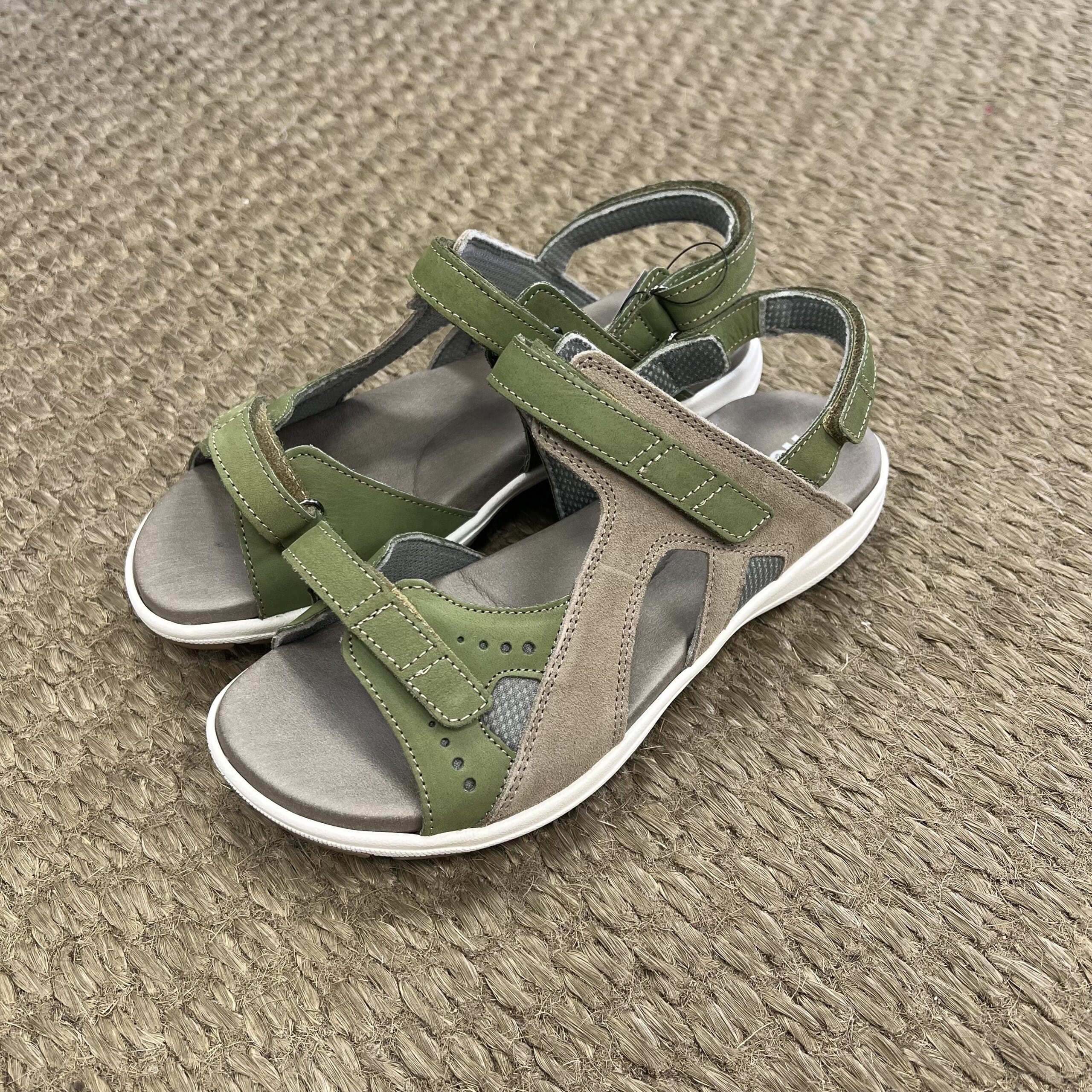 Nydelige sandaler fra New Feet i en fin grønnfarge. To regulerbare remmer over vristen, en regulerbar rem bak hælen. God støtte i fotbuen, sålen er uttagbar.