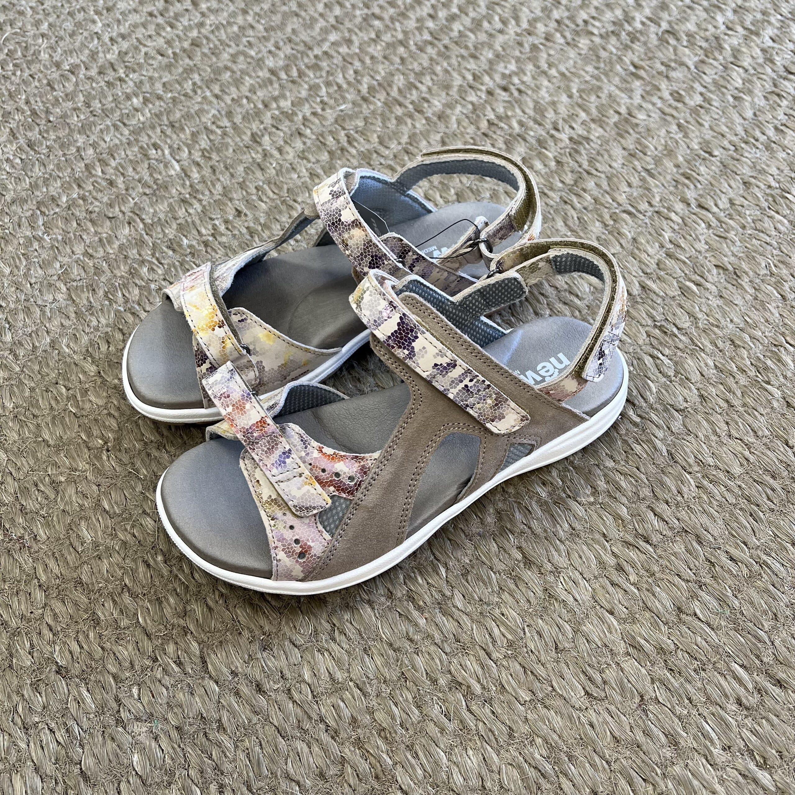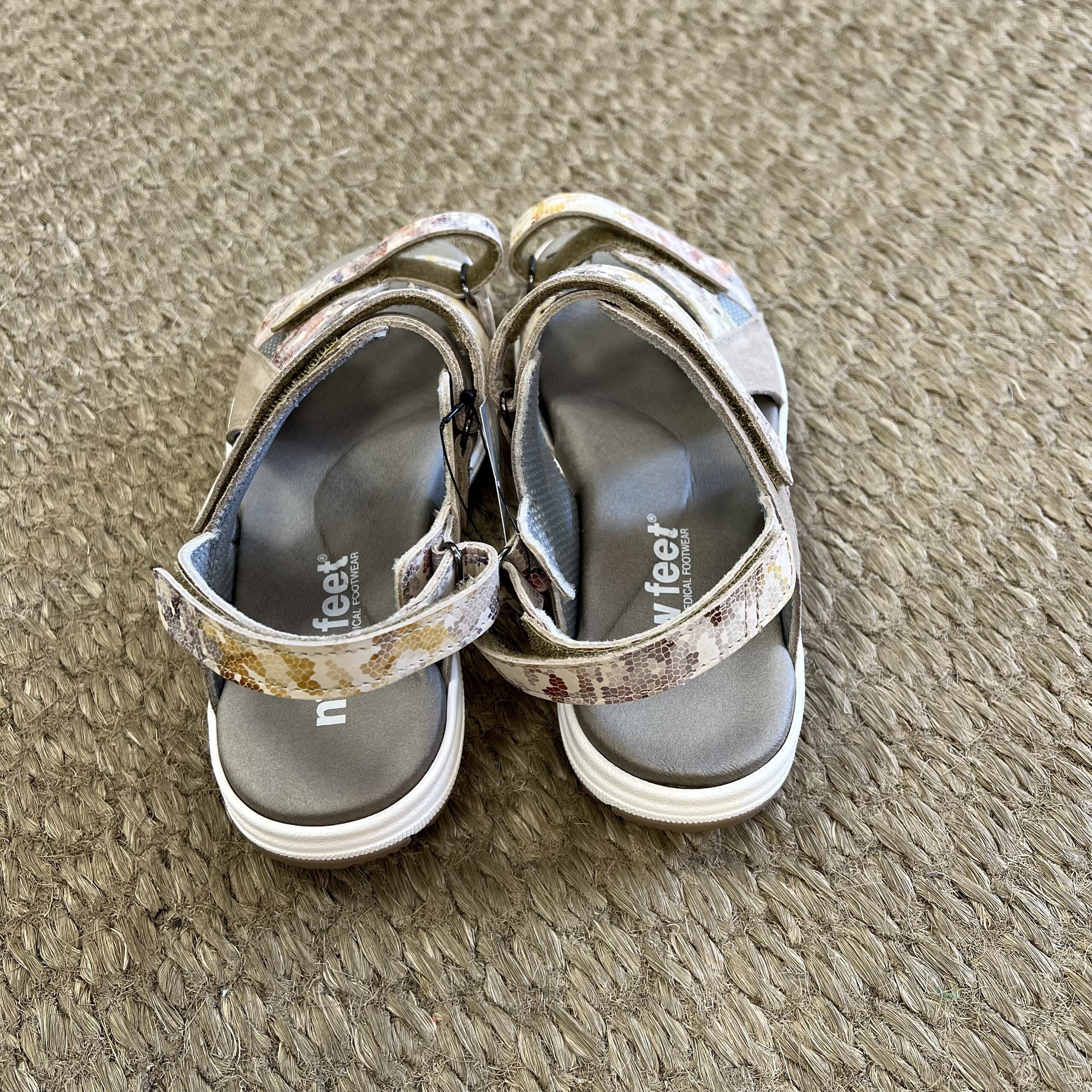 Flott sandal fra New Feet i to regulerbare remmer over vristen med nydelig print. Regulerbare rem bak på hælen. God støtte til foten lengdebue.