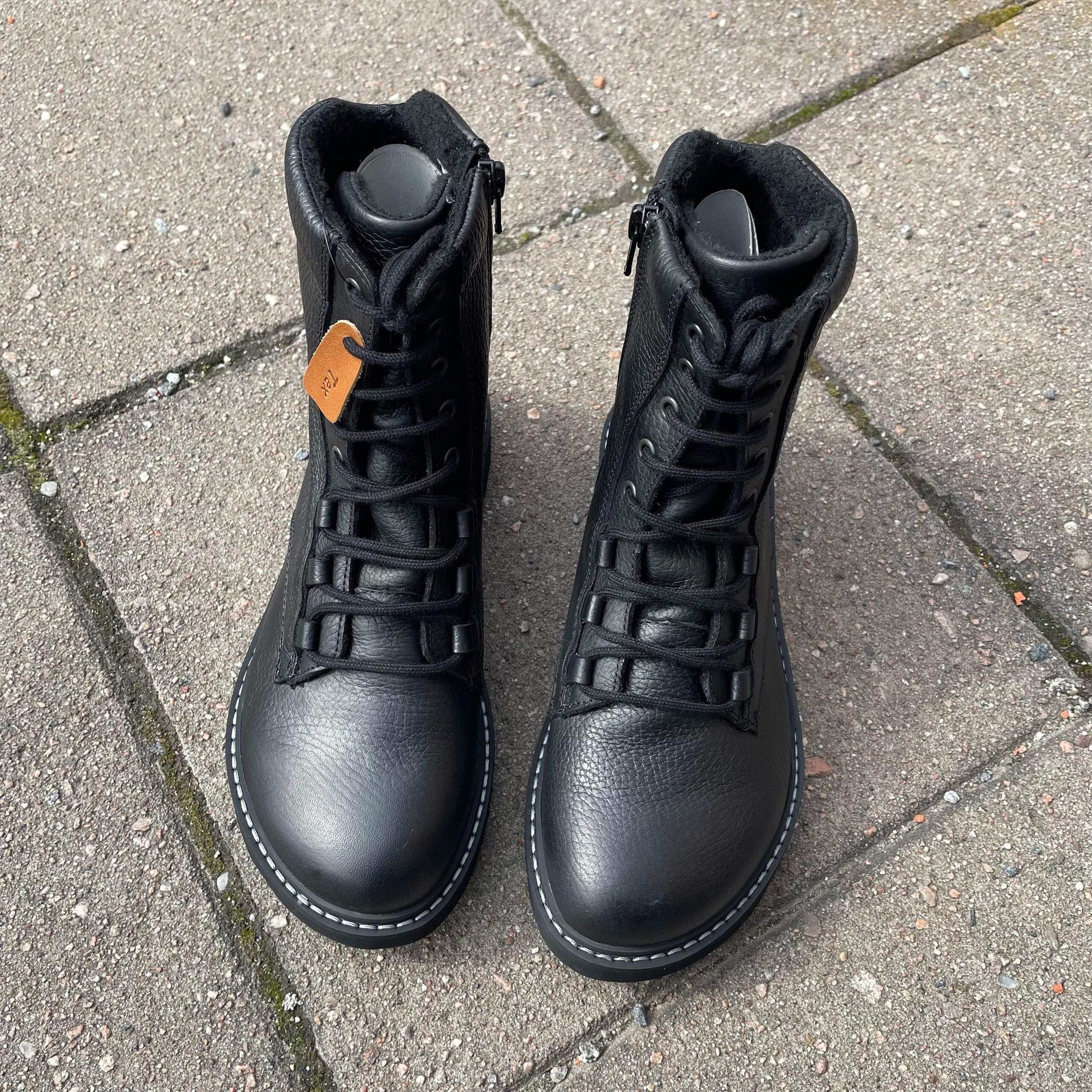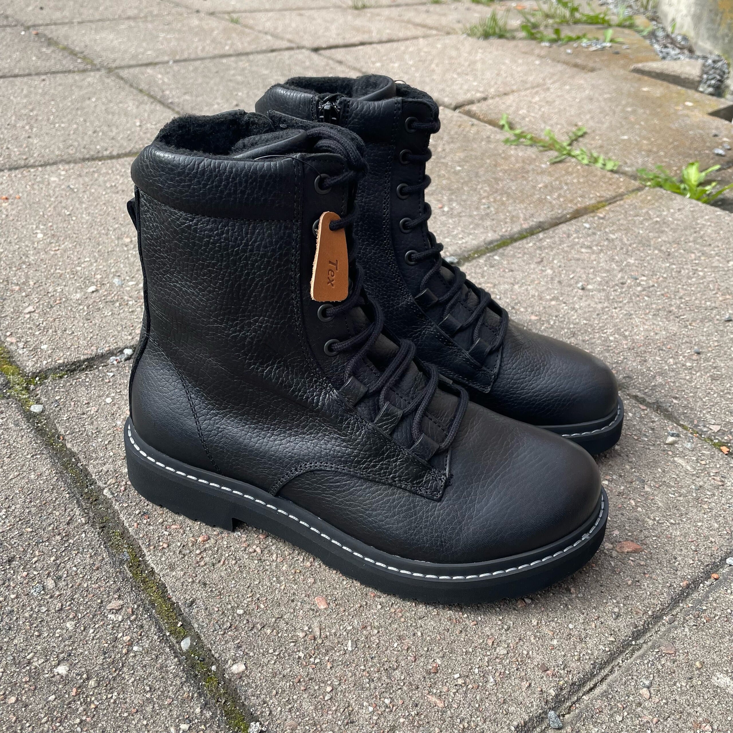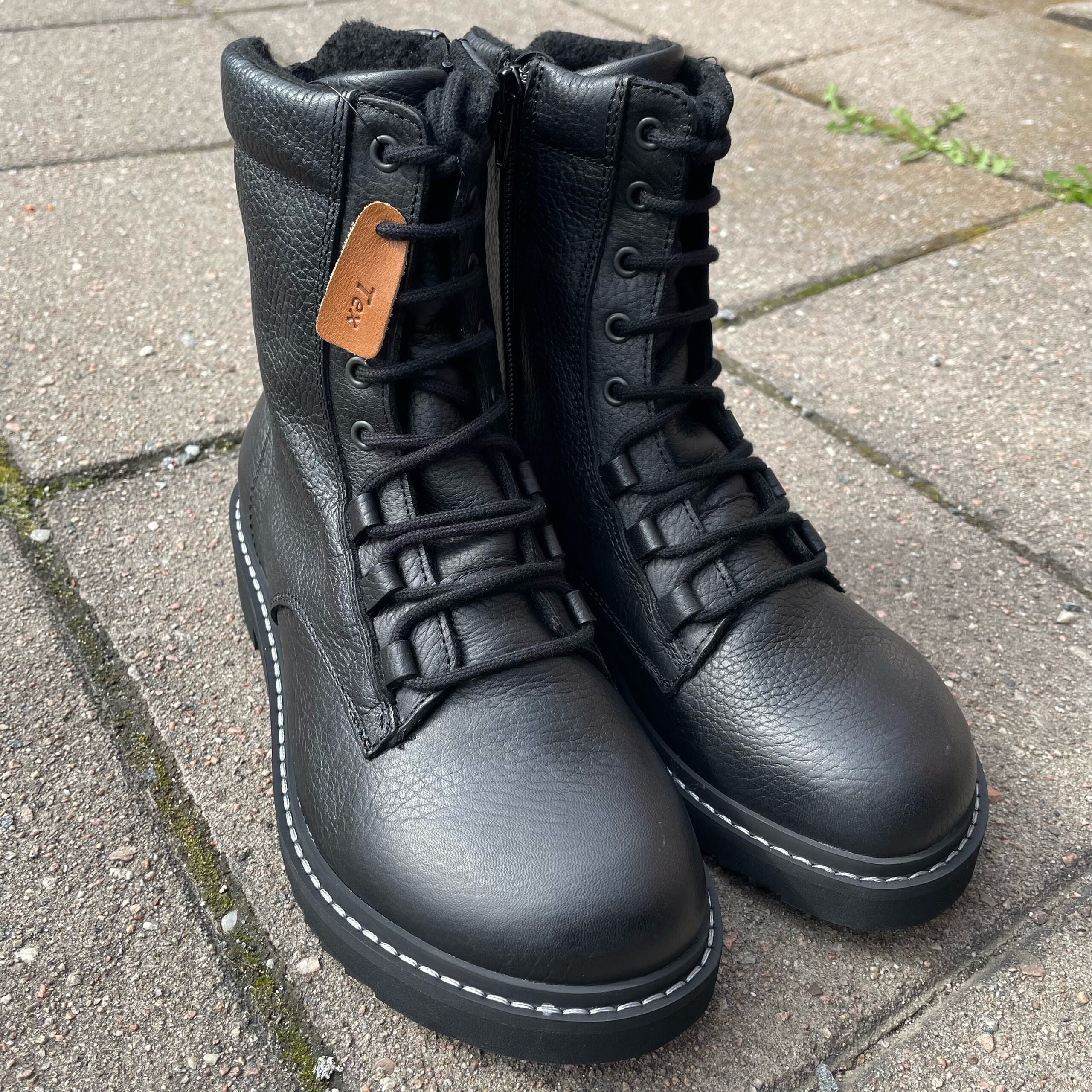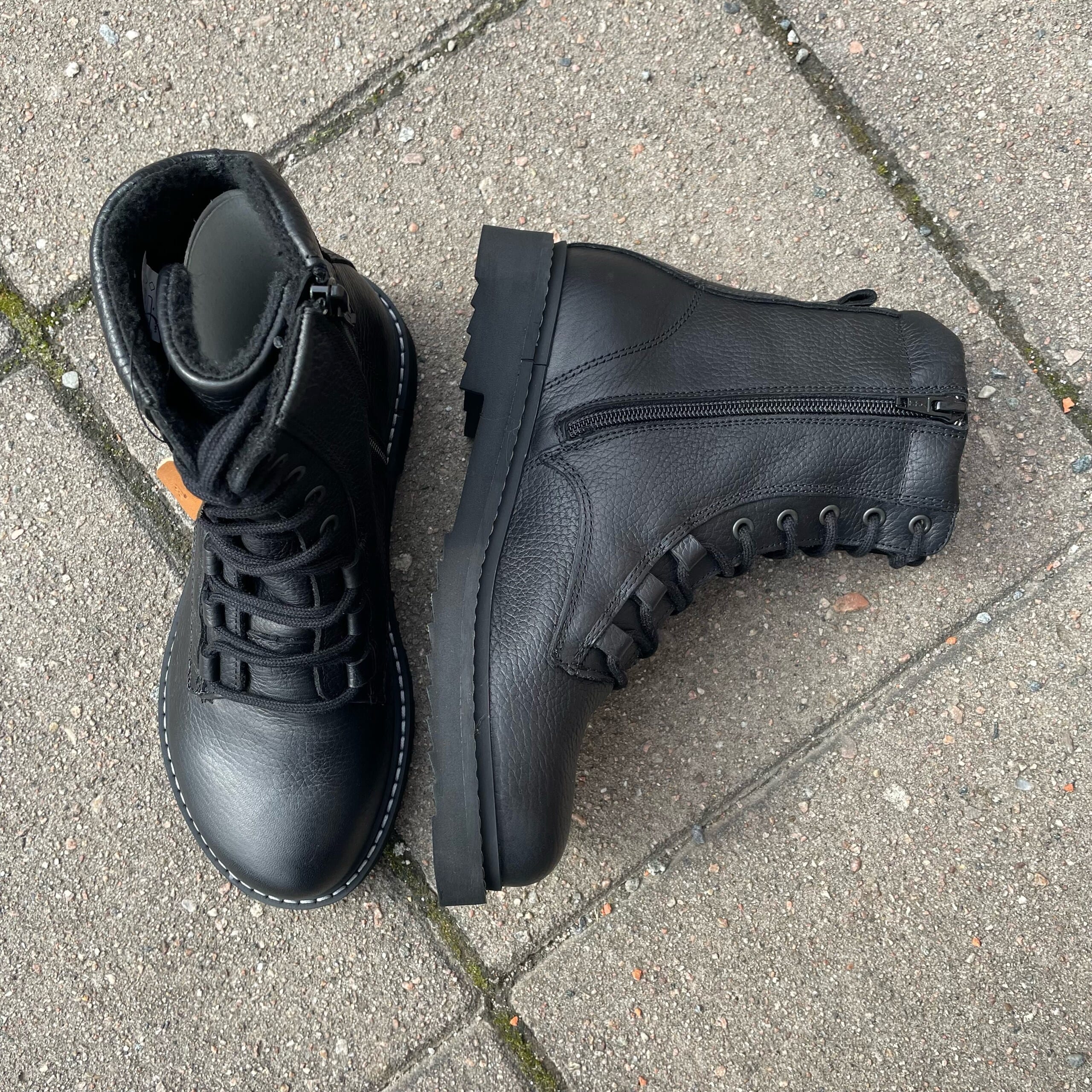 Stilige vinterboots fra New Feet i sort skinn og med deilig fôr på innsiden som holder deg god og vamr på føttene på kalde dager. Disse skoene har snøring, og glidelås på innersiden.